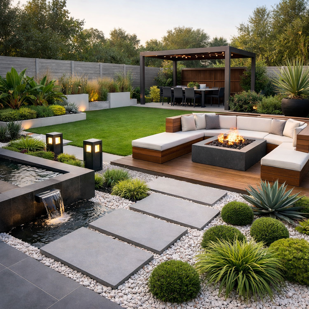 Esse layout de jardim moderno segue um conceito muito valorizado hoje: integração entre estética, conforto…