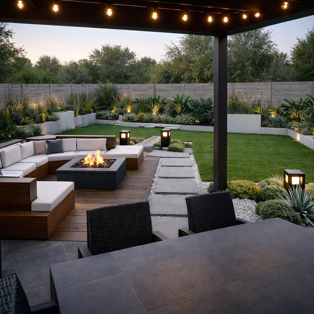 Esse layout de jardim moderno segue um conceito muito valorizado hoje: integração entre estética, conforto e funcionalidade.